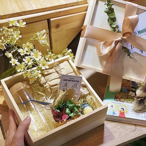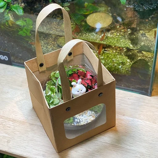 Terrarium DIY Set Packaged in an exclusive gift basket with ribbon, card, and a transparent bag. (Pre-order in advance needed. Not available as ready stock)
